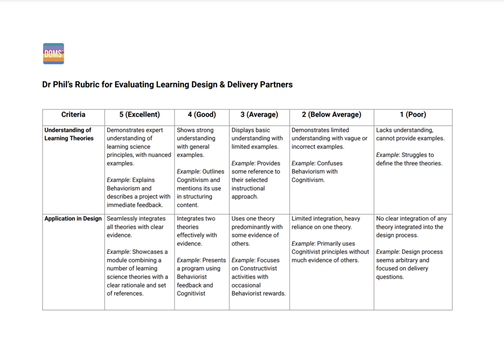 Dr Phil’s Rubric for Evaluating Learning Design & Delivery Partners